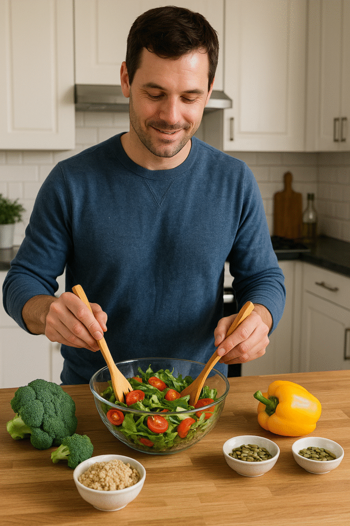 - Salat med kikærter, quinoa og grøntsager (plantebaseret protein og fibre).